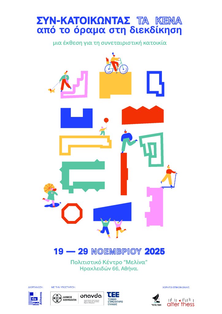 Με μεγάλη χαρά σας προσκαλούμε στην έκθεση για τη συνεταιριστική κατοικία «Συν-κατοικώντας τα Κενά: Από το όραμα στη διεκδίκηση» στην οποία θα παρουσιαστούν τα αποτελέσματα του Νεανικού Συνεργατικού Διαγωνισμού «Συν-κατοικώντας τα Κενά» για τη Μετατροπή Κενών Κτιρίων σε Στεγαστικούς Συνεταιρισμούς έναν χρόνο μετά την ολοκλήρωσή του.
