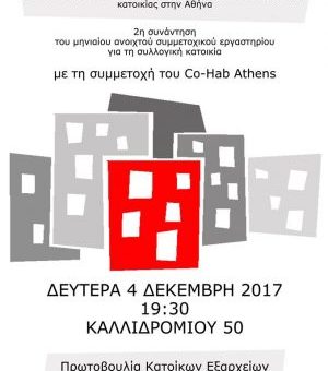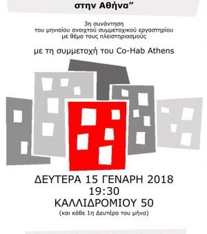 To Co-Hab Athens συνεχίζει για δεύτερη χρονιά το εργαστήριο για τη συλλογική κατοικία και σας καλεί να συμμετάσχετε και να γίνετε μέρος της ομάδας. 1η συνάντηση Παρασκευή 2 Νοεμβρίου στις 18.30 @Α36 (Αισχύλου 36, Ψυρρή, 1ος όροφος) Μετά τον πρώτο κύκλο σε συνεργασία με την Πρωτοβουλία κατοίκων Εξαρχείων, ο οποίος ολοκληρώθηκε με ένα εντατικό εργαστήριο…