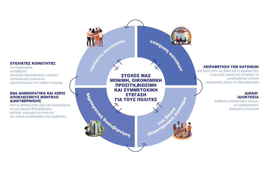 Το εγχείρημά μας για τη συνεργατική κατοικία ξεκίνησε από την κοινή επιθυμία μιας ομάδας πέντε φιλενάδων να επαναορίσουν έναν νέο τρόπο συλλογικής κατοίκησης, που θα απαντά στις προκλήσεις της κοινωνική και οικονομική μας πραγματικότητα. Με έμφαση στη συλλογικότητα, την αλληλεγγύη και τη βιωσιμότητα, στοχεύουμε να επαναπροσδιορίσουμε την έννοια του κατοικείν, μέσα από νέα εναλλακτικά μοντέλα οικογένειας. Η δική μας δράση θέλουμε να αποδεικνύει πως μπορούμε πάντα να διεκδικούμε το δικαίωμα για ασφαλή και δίκαιη κατοικία. Και πως με την δημιουργία ισχυρών συνεργατικών ομάδων, οι οποίες δρουν συλλογικά και με επικοινωνία μεταξύ τους, οραματιζόμαστε την ελεύθερη και δημοκρατική διαχείριση των κατοικιών μας.