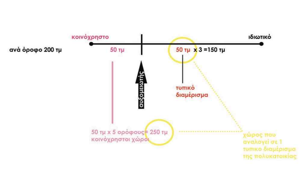 Κεντρικό στοιχείο της πρότασης είναι οι κοινόχρηστοι χώροι, όπως σαλόνια, κουζίνα, παιδότοπος και πολυχώρος, που ενισχύουν τη συνεργασία μεταξύ των ενοίκων. Επιπλέον, το ισόγειο λειτουργεί ως ανοιχτός χώρος για τη γειτονιά, περιλαμβάνοντας εστιατόριο, αίθουσα χορού και ανταλλακτική βιβλιοθήκη, ενώ στο υπόγειο βρίσκεται γυμναστήριο διαθέσιμο και για το κοινό. Η οικονομική βιωσιμότητα εξασφαλίζεται μέσω ενοικίων και των εσόδων από τους δημόσιους χώρους, διασφαλίζοντας μακροχρόνια πρόσβαση σε προσιτή στέγη.