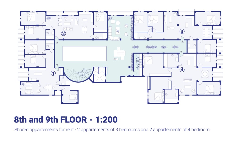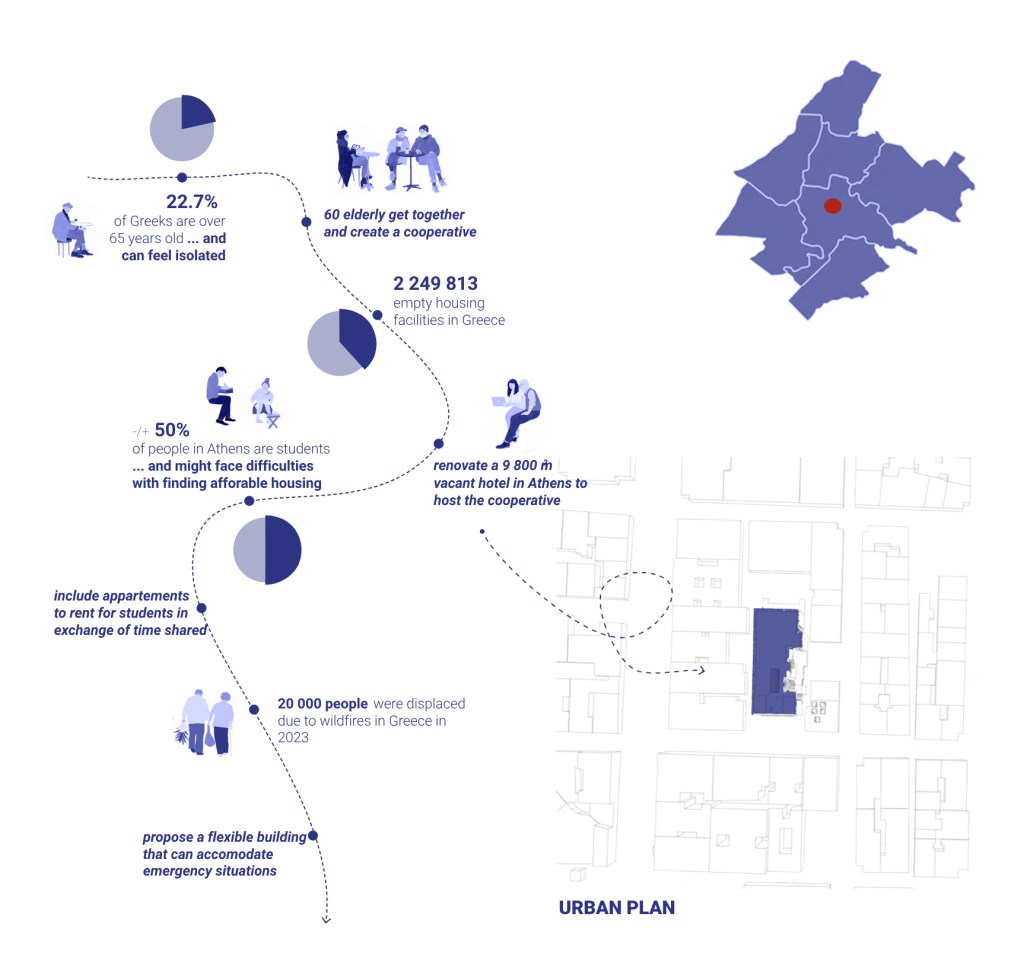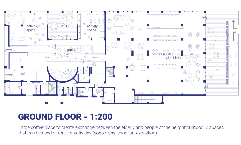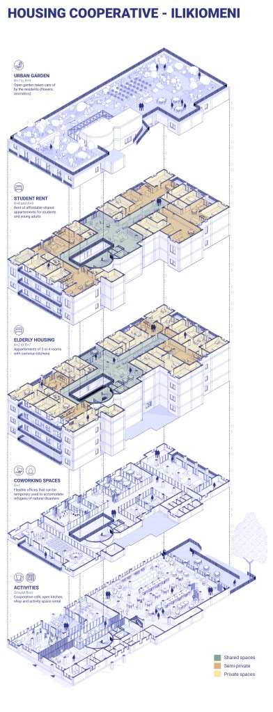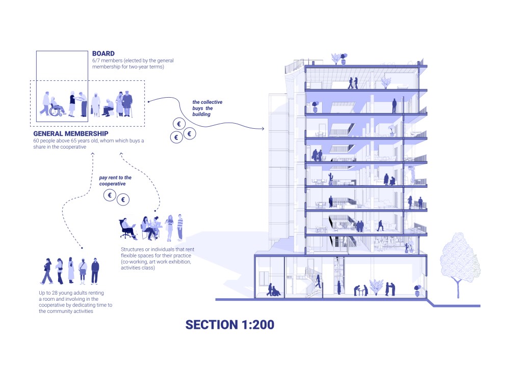 The project is designed as a collaborative space where elderly people and young students live and grow together. Students benefit from affordable housing while contributing their time and skills to support the cooperative, fostering a mutually enriching environment.